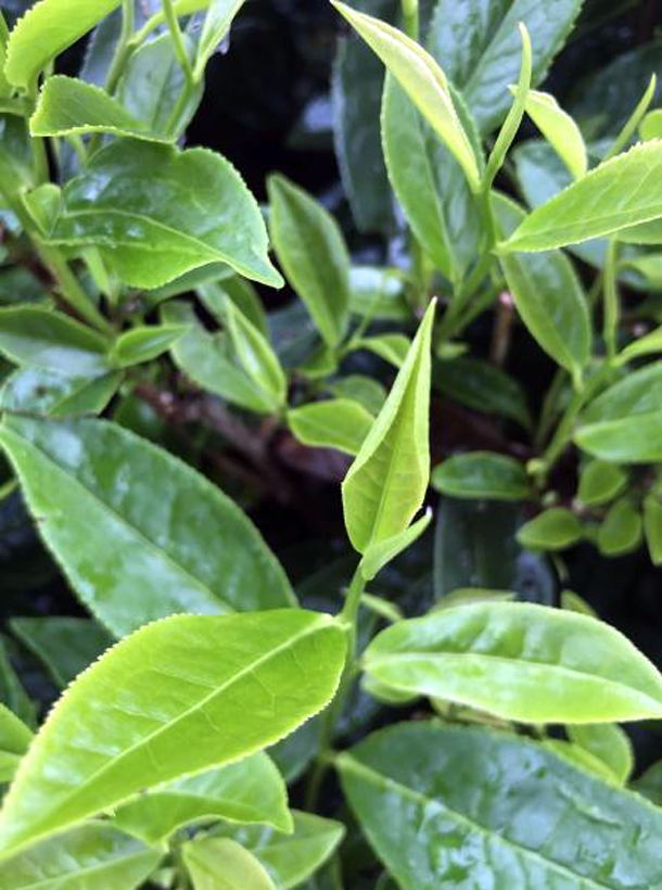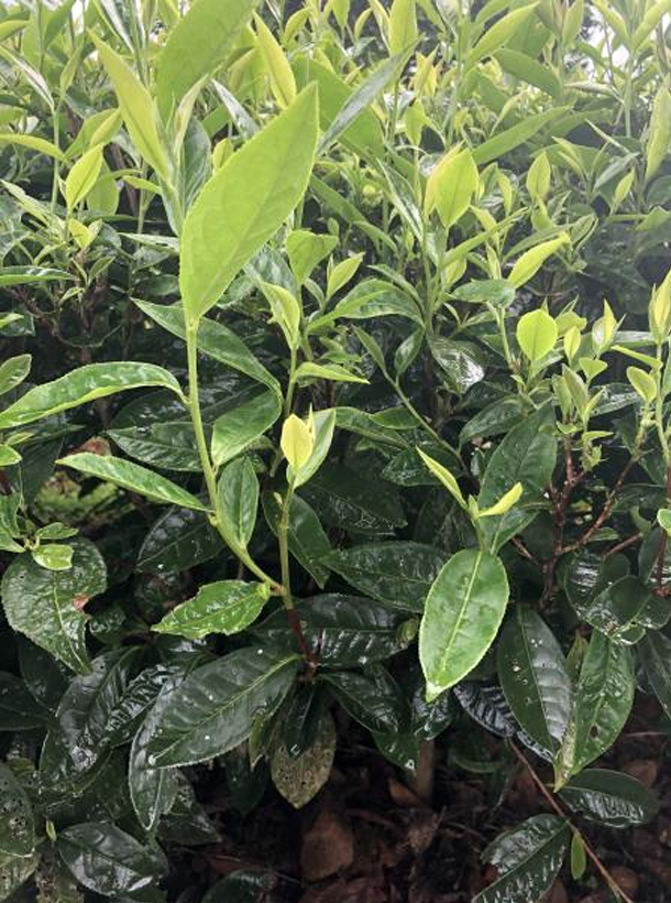 【性状特征】茶树无性系品种之一,叶长椭圆形,叶色黄绿,有光泽,叶面较平,叶尖渐尖,叶质较柔软,芽叶黄绿色。灌木型,中叶类,树姿半开展,叶长9.2cm,叶宽3.3cm,叶面平整叶色黄绿,分枝密度适中,叶着生上斜。3月中旬萌芽,4月中旬开采。花冠长宽为3×31mm。花瓣6-8片,花萼无毛,抗逆性强。